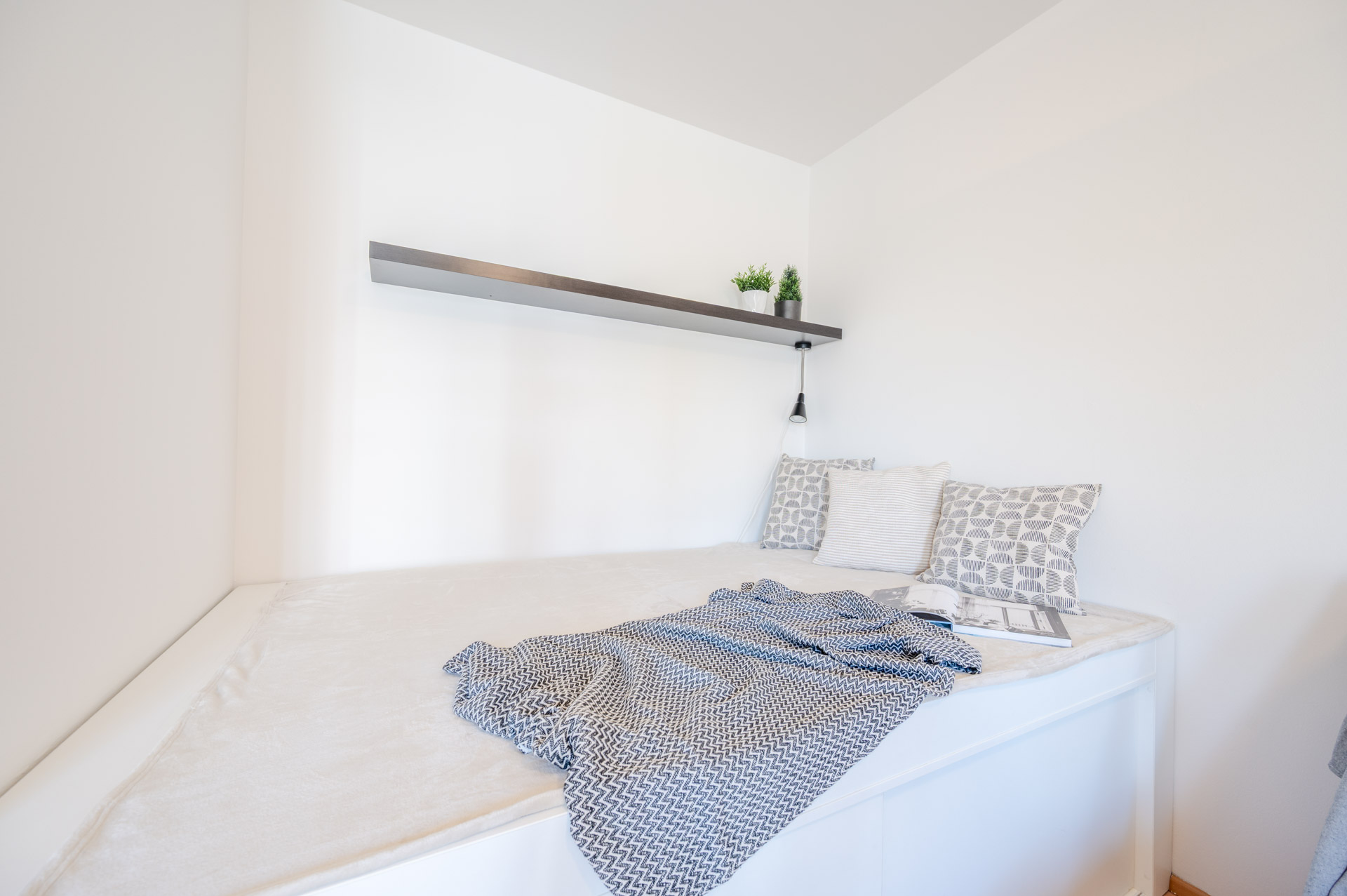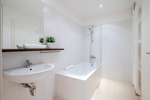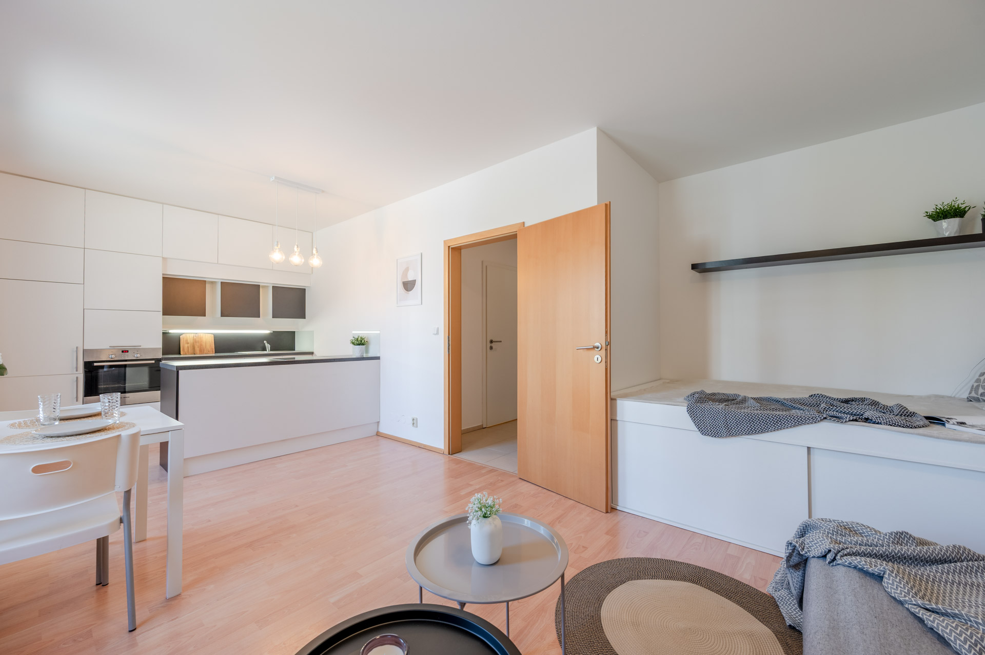 Byt je výborně dispozičně řešený, najdete v něm vše potřebné, skládá se z předsíně, šatny, koupelny (s vanou a umyvadlem), samostatné toalety, technické místnosti (s přípojkou na pračku) a prostorné, prakticky členěné místnosti s kuchyňským koutem (s lednicí, mrazákem, varnou deskou, digestoří a troubou). Kuchyň odděluje ostrůvek od obývací a jídelní části. Prostor na spaní byl vytvořen na míru ve výklenku.