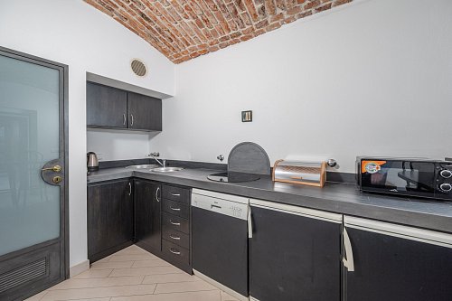 Prostory o podlahové ploše 153 m2 jsou velmi privátní a mají k dispozici vlastní velkou střešní terasu vysypanou šterkem se zahradními prvky a posezením. Prostory se skládají z velkorysé centrální místnosti se střešními okny, ze které vedou jednotlivé vstupy do dalších 2 menších místností / kanceláří a do kuchyňky. Ke každé místnosti a kuchyňce připadá jedna koupelna, celkově jsou k dispozici 3 koupelny. K oběma menším místnostem navíc přiléhají komory. Střešní terasa je přístupná z centrální místnosti točitým venkovním schodištěm a rozprostírá se nad celou centrální místností. Kuchyňka je vybavená. Bezpečnostní dveře. Vlastní plynový kotel na ohřev vody a vytápění.