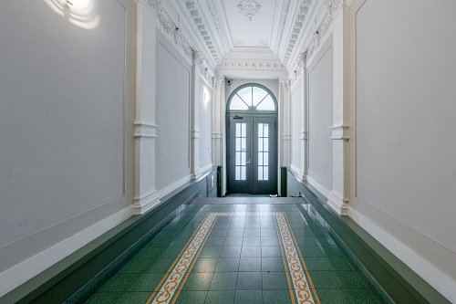 Po vstupu do činžovního domu vás uvítají působivé vnitřní prostory s nově obnovenými historickými prvky. Na první pohled vás upoutá schodiště s původním zdobným zábradlím, dvoukřídlé dveře, poštovní schránky a okenní vitráže.