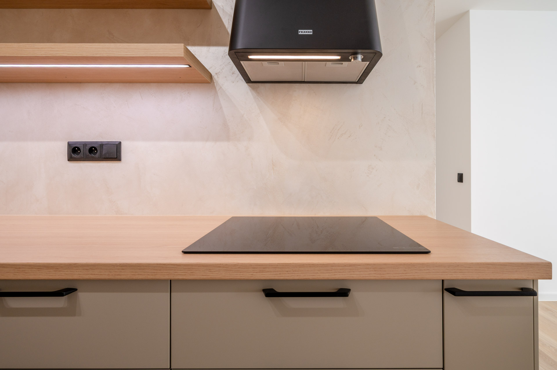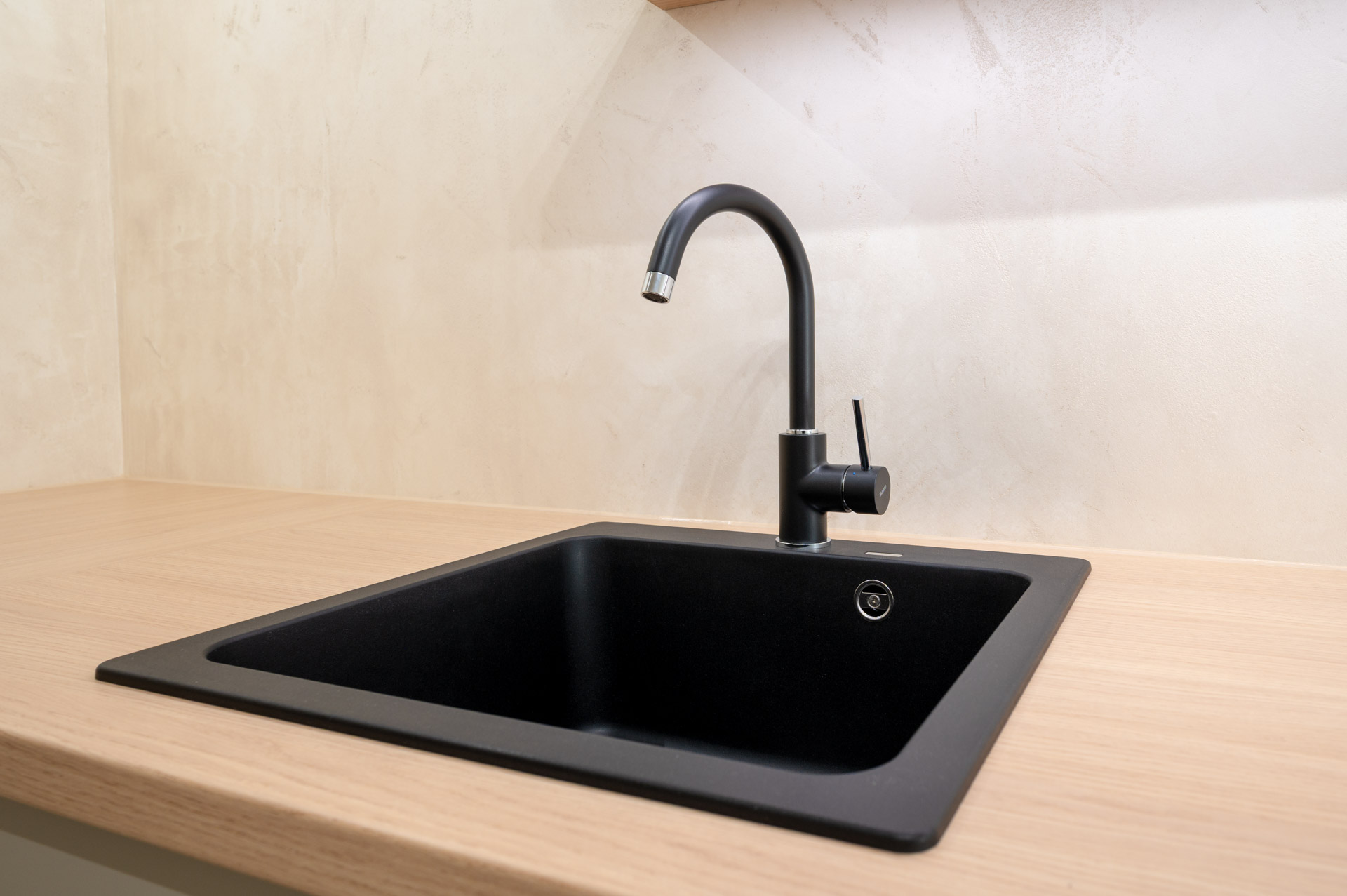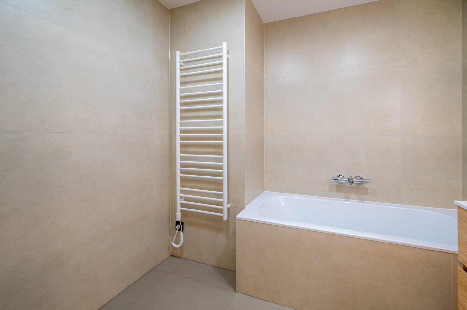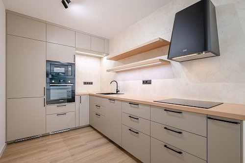 Kuchyňská linka disponuje velkou pracovní plochou s osvětlením a vestavěnými spotřebiči Bosch (pečící trouba, mikrovlnná trouba, indukční varná deska), Ikea (lednice, mrazák, myčka), designovou digestoří Franke a je doladěna atraktivní, dobře udržovatelnou stěrkou. Koupelna je obložena působivými velkoformátovými obklady a vybavena vanou, umyvadlem se skříňkou, zrcadlem, topným žebříkem a přípojkou na pračku a sušičku. Toaleta je samostatná, s bidetovou sprškou. Nová okna s izolačním dvojsklem a žaluziemi jsou orientována na západní stranu, do korun vzrostlých stromů. K bytu náleží zděná sklepní kóje (1,15 m2) umístěná v přízemí. V domě je také k užívání kolárna.